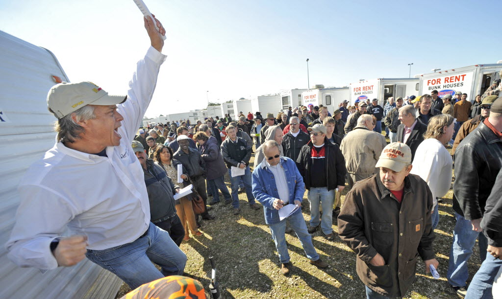 Ken Buhler shouts as a prospective buyer signals a bid Saturday at a public auction of about 400 former FEMA trailers Saturday at the Lamar-Dixon Expo Center in Gonzales.