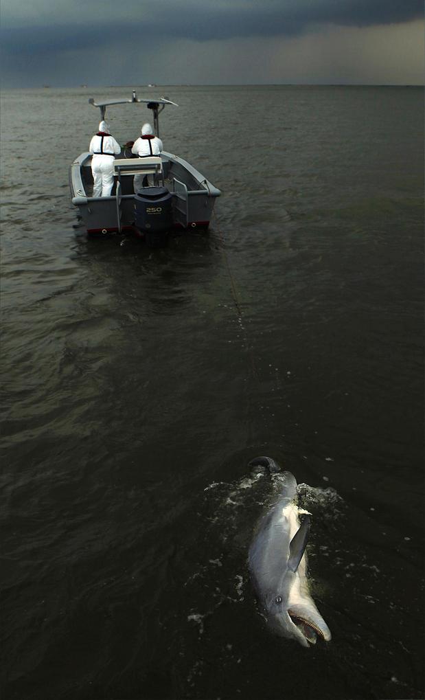 Biologists from the Louisiana Department of Wildlife and Fisheries recovered a dead dolphin off of Grand Isle, La., on May 29. The dolphin was to be taken for testing to see whether its death was the result of exposure to toxins from the Gulf of Mexico oil spill.