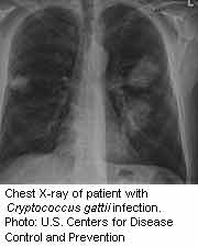 C. gattii infection causes a prolonged cough, shortness of breath, headache, fever, weight loss, and, in some patients, a stiff neck, according to Harris. The fungal infection is not contagious among people, she added.