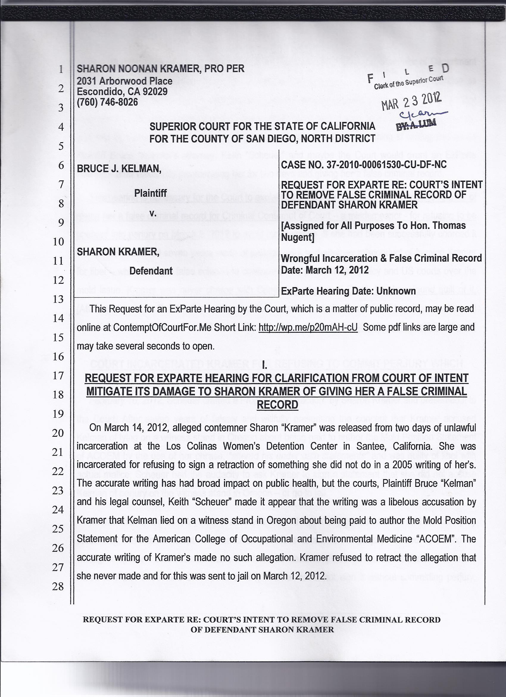 March 23, 2012 ~ REQUEST FOR EXPARTE RE: COURT’S INTENT TO REMOVE FALSE CRIMINAL RECORD OF DEFENDANT SHARON KRAMER