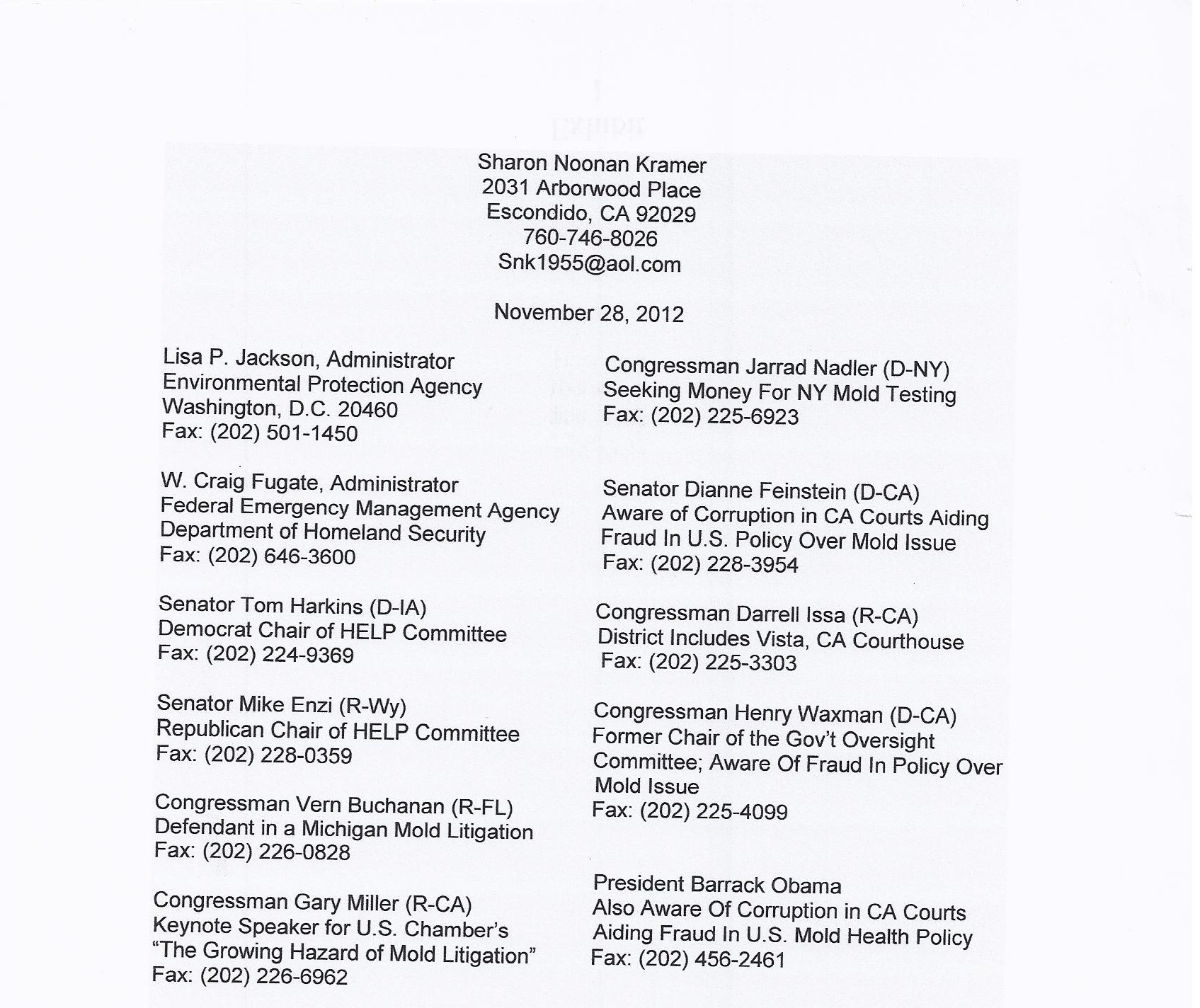 Thank you for your prompt attention to these gravely serious matters that have needed to be addressed by our nation’s leaders for now, years – scientific fraud in public health policy over the mold issue and compromised leadership of the California judicial branch adversely impacting the health and safety of the entire United States, including the victims of Hurricane Sandy.