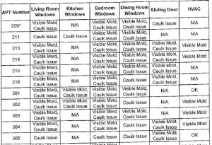 These pages show apartments that were visually inspected for mold and the results. 49 out of just the 76 that were actually inspected show VISUAL MOLD in the HVAC system!