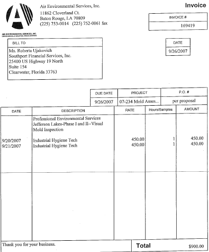 Notice at bottom of the last page – ***Contract was signed with sample costs equal to $50.00/sample for 5 day lab T/A. However, Ralph/Connie requested 24-hour lab T/A and new pricing ($87.00/sample) was verbally accepted and agreed on 5/10/05. A 24 hour air test will usually not show mold – it needs at least 48 hours.