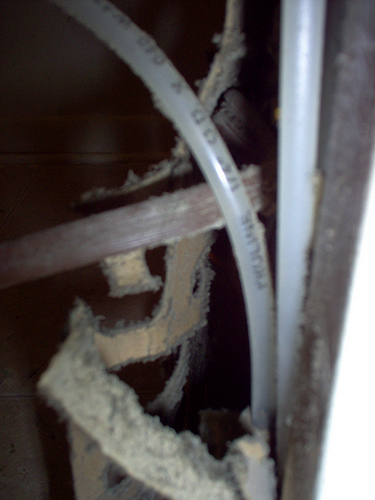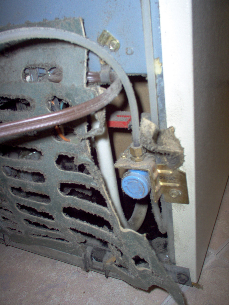 I pulled the refrigerator out from the wall because I noticed something on the baseboard between the cabinet and refrigerator I had not seen before. The wall was falling apart behind the refrigerator. This is actually how it is when the apartment is leased!!! The mold is creeping along the baseboard but has also grown on the hose leading to the back of the refrigerator and is destroying it too.